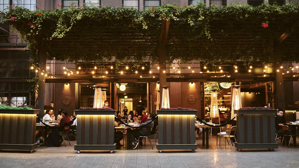 Burma Love Downtown's enclosed patio is a charming outdoor space for private events. Enjoy fresh air, nighttime lighting, and heat lamps for optimal comfort.